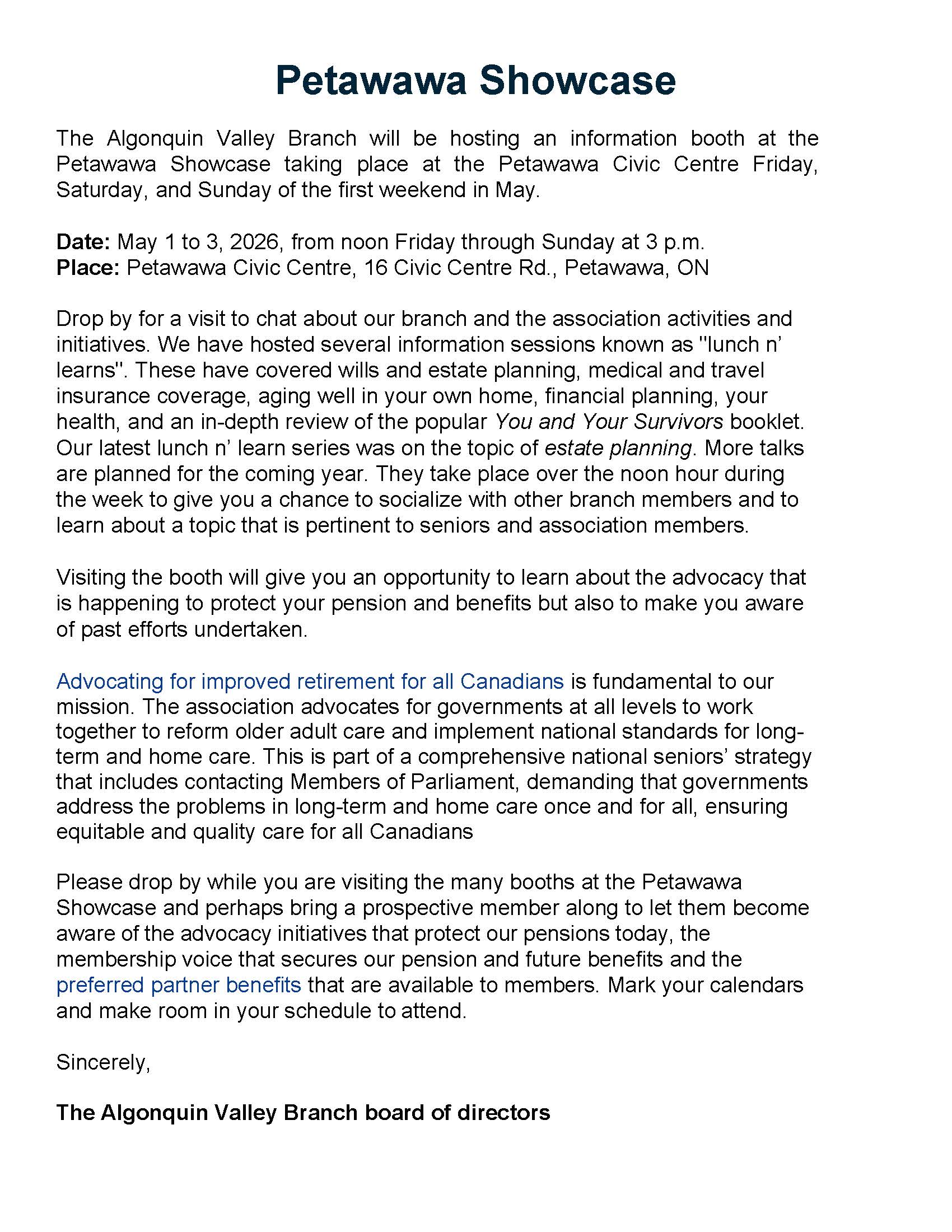 Broadly-speaking, the Association’s work is to significantly improve the quality and security of retirement for our members and all Canadians through advocacy and the provision of services. In addition, Members benefit from a wide range of discounts and enhanced services provided by our Preferred Partners.